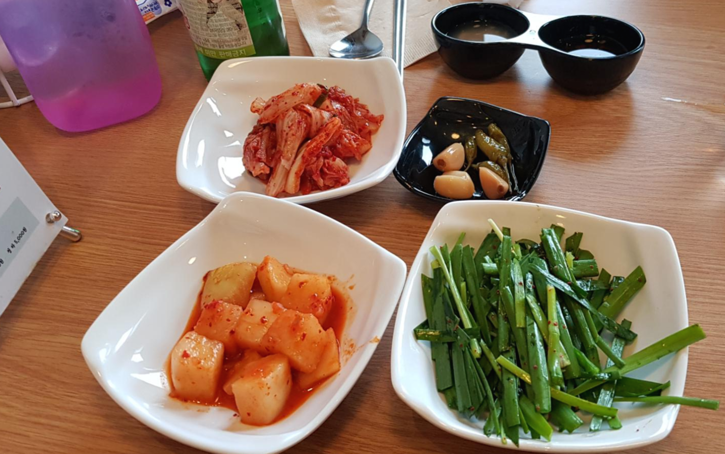 국밥과 어울리는 김치, 깍두기, 살짝 무친 부추, 마늘고추 초절임.