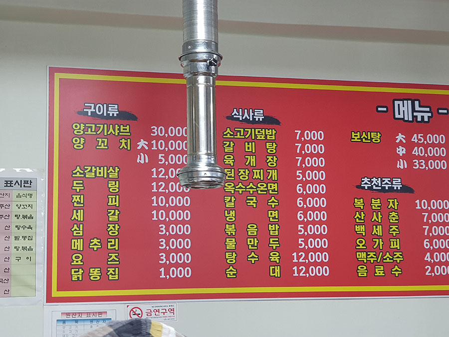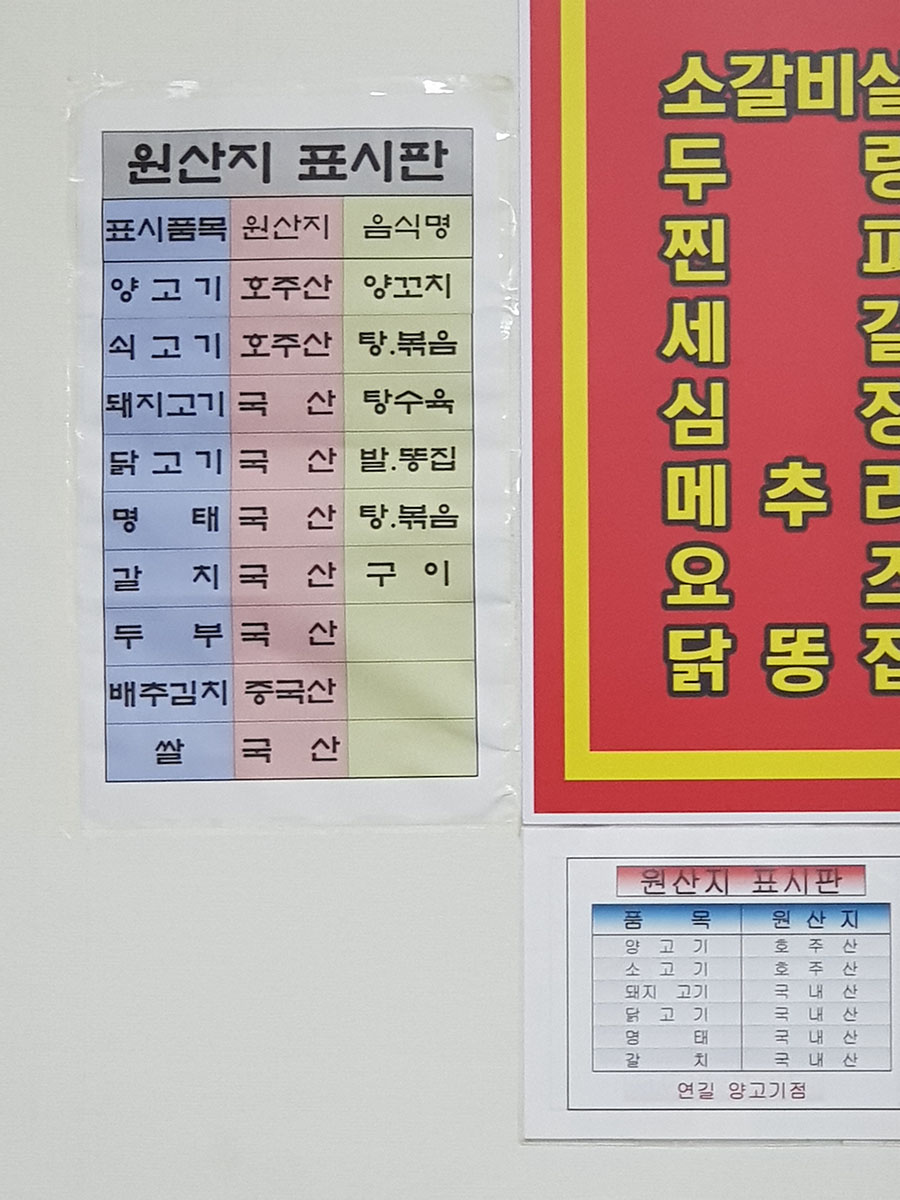 양고기와 소고기는 호주산, 돼지고기, 닭고기, 명태, 갈치, 두부는 국산, 배추김치와 쌀은 중국산입니다. 재료가 어떤 음식에 쓰이는지 음식명까지 친절히 표시해 놓았습니다.