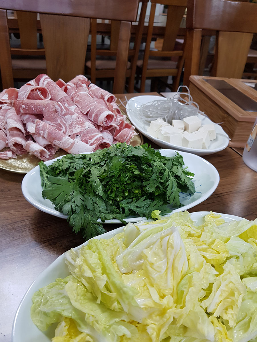 저녁 장사 전이라 음식점 내부에서 사장님이 식재료를 다듬고 계시더군요. 제일 꼭대기의 주메뉴 양고기샤브가 있어 먹기로 했습니다.