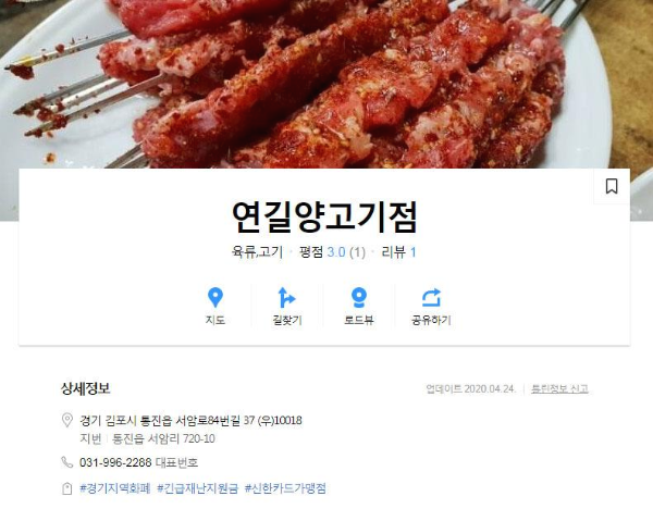 간판에는 연길양고기구이점이라고 써 있지만 카카오맵에는 연길양고기점이라고 등록되어 있네요. 경기지역화폐 및 긴급재난지원금 사용처이기도 합니다.