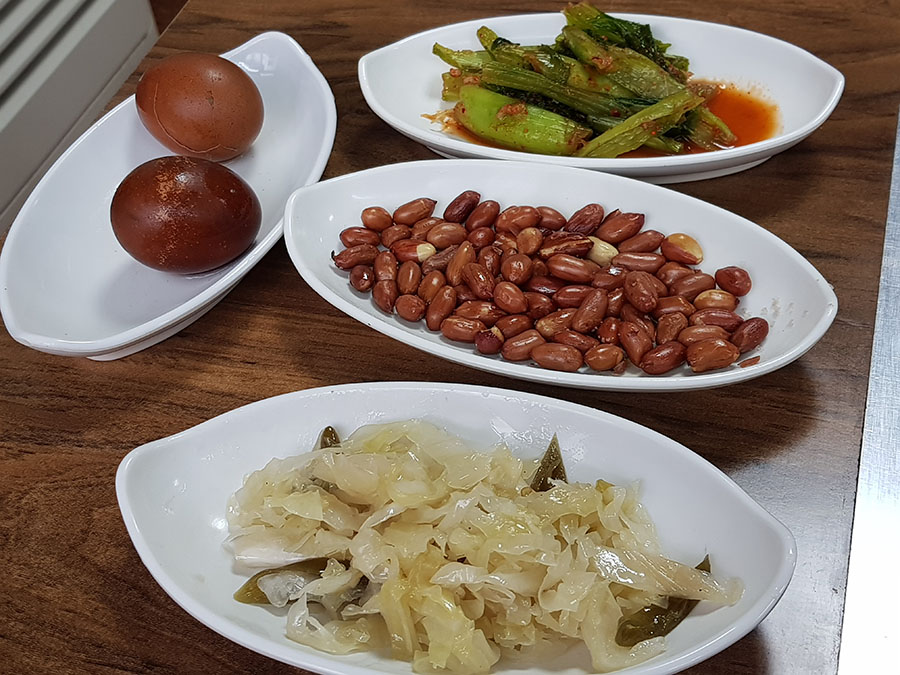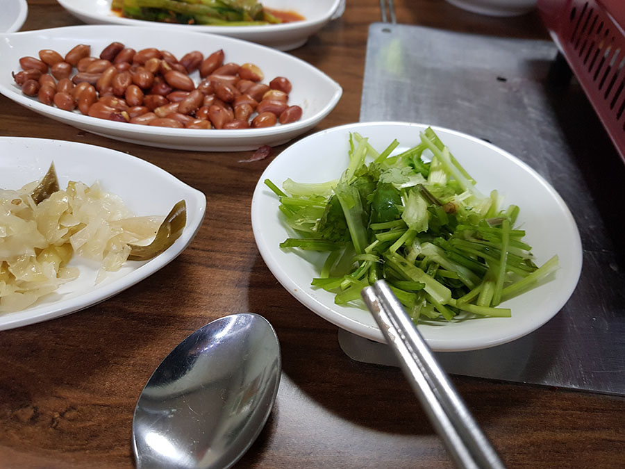 밑반찬으로 오래 조린 차단?, 갓김치, 중국식 땅콩볶음과 백김치 쏸차이(쑤안차이:酸菜)가 나오며 반찬이 전반적으로 짜지만 맛은 있습니다.
