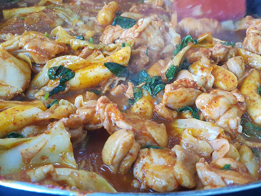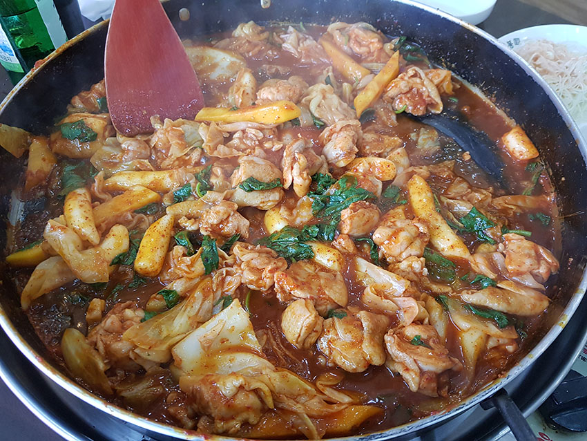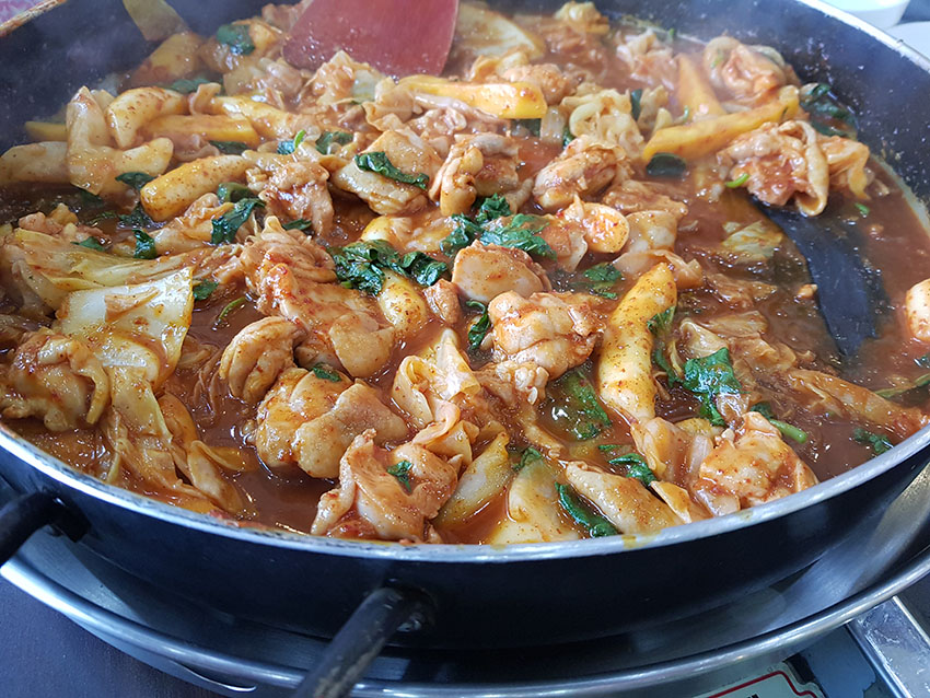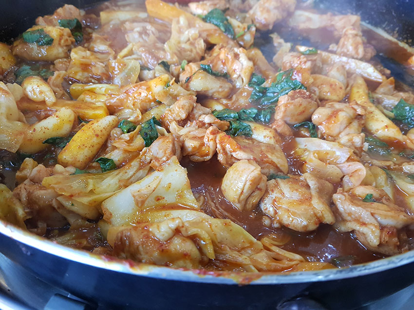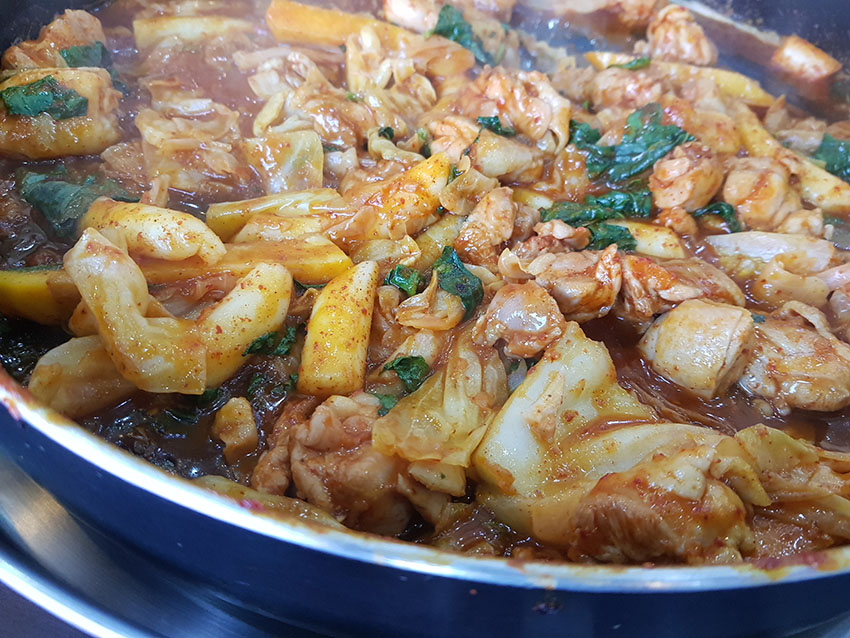 약간 매콤하고 양념이 잘 밴 닭갈비의 맛이 철판에 볶을수록 점점 더 맛있어집니다.