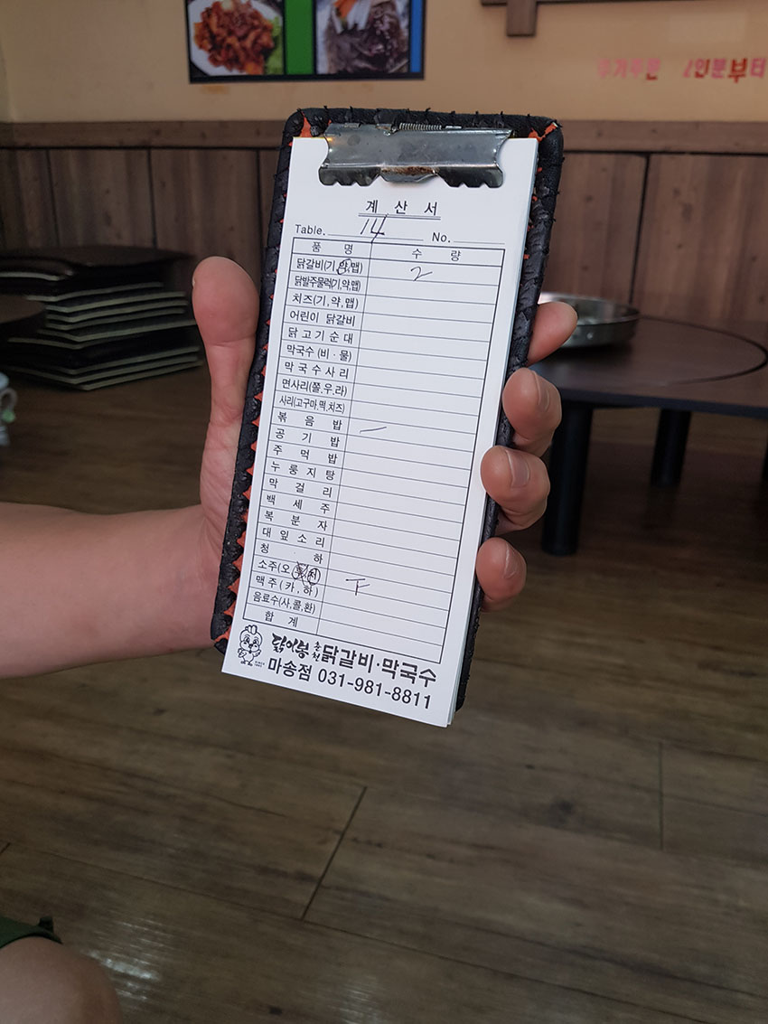 볶음밥까지 다 먹고 나와서 계산서를 보니, 소주를 3병이나 마셨네요. 닭갈비 2인분 22,000원 + 볶음밥 1인분 2,000원 + 소주 3병 12,000원 = 36,000원 나왔네요.