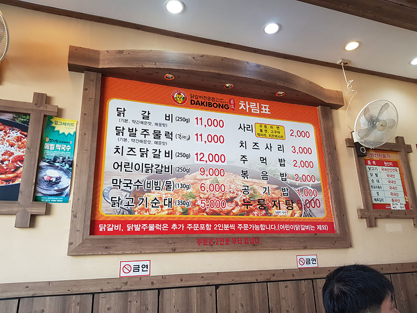 닭갈비 250에 11,000원 닭발주물럭 200g에 11,000원, 치즈닭갈비 250g에 12,000원, 어린이닭갈비 250g에 9,000원, 막국수(비빔/물) 130g에 6,000원, 닭고기순대 350g에 5,000원 가격들이 착한 편입니다.