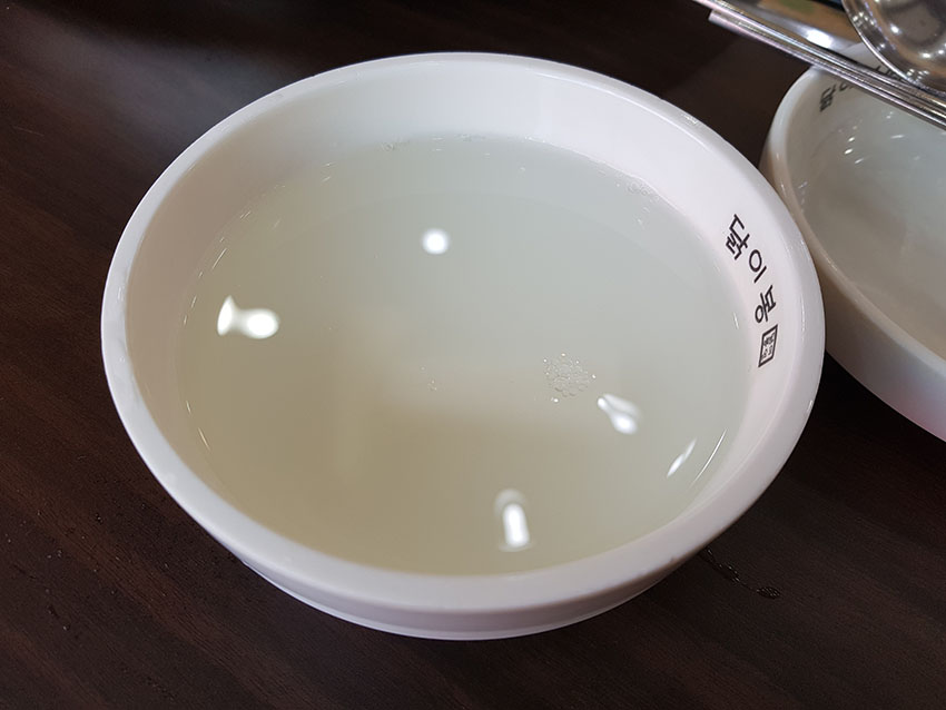 여름에 없어서는 안될 살얼음이 떠 있는 시원한 동치미, 여느 체인점처럼 그릇에 로고와 상호명이 써 있습니다.